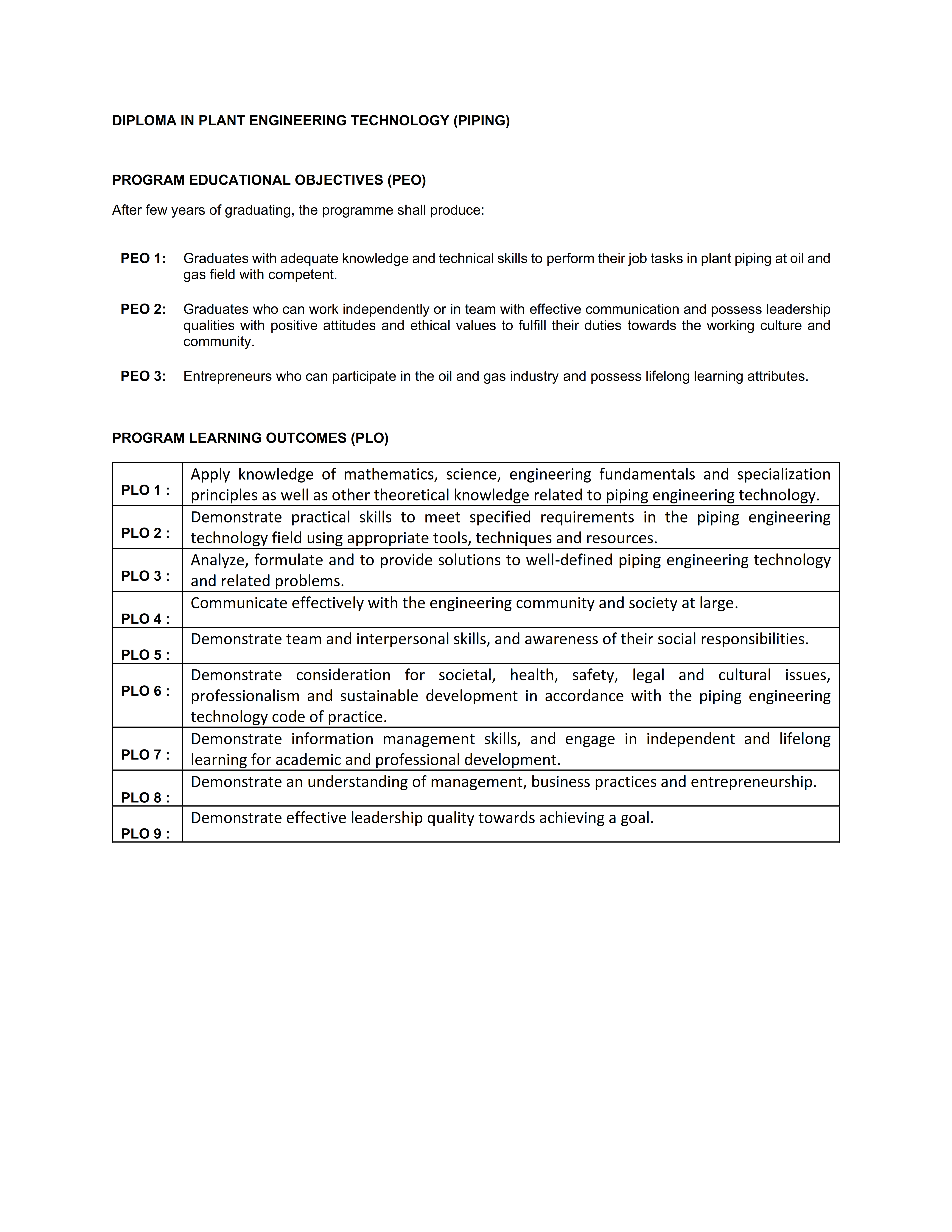 | PEO 1 | Graduates who can apply their analytical technical knowledge and hands-on skills to perform their job tasks in piping design and construction of industrial plant facilities with competency. | PI 1: 75% of graduates work in related fields |