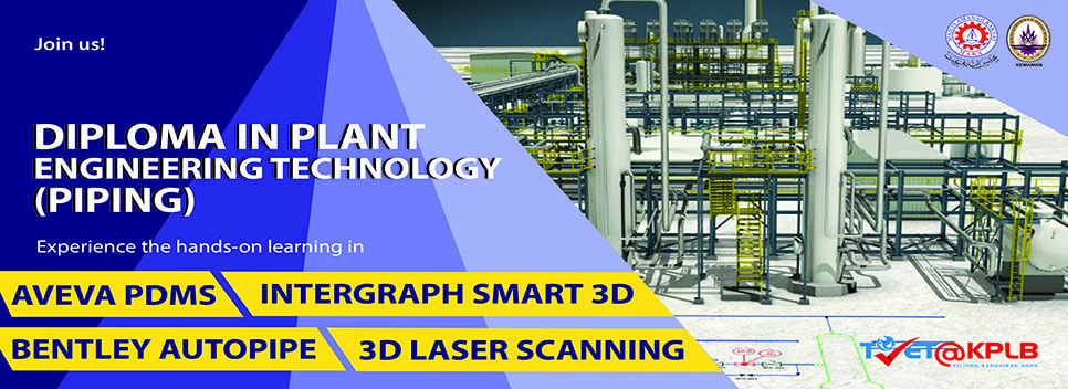 The Diploma Program in Plant Engineering Technology (Pipeline) is designed to produce graduates who have the knowledge and skills required by the oil and gas industry, particularly in pipeline engineering. In this program, graduates learn piping design skills based on codes and standards, plant layout principles and procedures, and an introduction to pipe stress analysis. The graduates are also exposed to plant design software such as AVEVA Plant Design Management System (PDMS), Intergraph Smart Plant 3D (SP3D), Autodesk AutoCAD Plant 3D and Bently AutoPIPE. In addition, the graduates are exposed to the roles and responsibilities as piping designers through the implementation of the final year project..